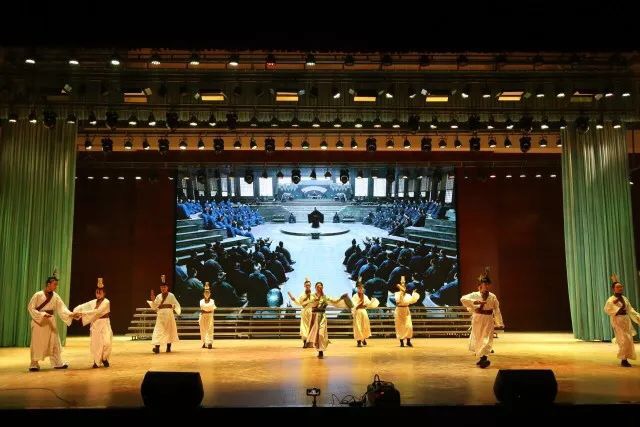 在第二环节中,崇德书院深抓历史教育经典这一核心,别出心裁的编排出舞蹈《求学路》。半部论语治天下,孔子之道是大国经典,舞蹈分为学子求学、孔子教学、学子出师三部分,台上少年手拿竹简,身着古装,举手投足间尽是儒雅,低头沉吟的样子一如先人圣贤就在舞台之上,与先人来个时空穿梭的对话。朗朗书声和着舞者们曼妙身姿,带给观众们的不仅是一次心灵的洗礼,更是一次艺术的熏陶。