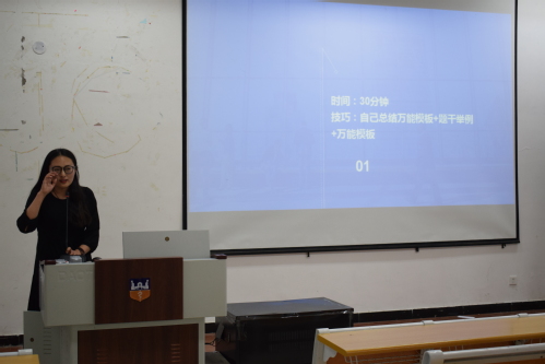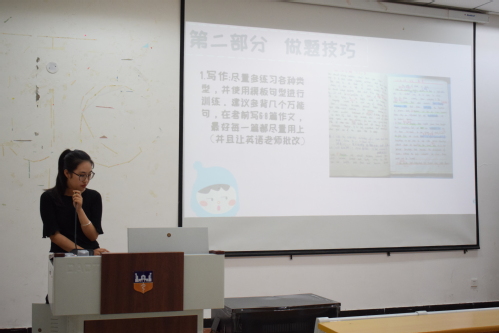 首先,上台宣讲的是车佳慧学姐,学姐主要向同学们分享了她自己的学习经验,以及准备考试的过程。她讲到学习英语是一个不断积累的过程,不是一蹴而就的。提高英语水平,需要在生活中,不断地学习记忆练习,多说多记多练,这样才能更好的提高英语水平,应对考试。