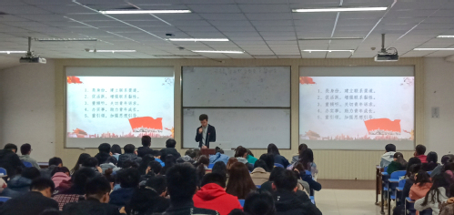 高鑫一详细讲解了如何做一名优秀的团干部。一名团干部要做到加强修养,清正廉洁,务真求实,牢记职责才能被称为是一名合格的团干部。紧接着,他又强调了团干部直接联系青年工作的重要性,提出团支部内要多开会、多见面交流,这样有利于增强团凝聚力,增强团员的团性观念。最后,高鑫一向大家阐述了团干部要对团员青年进行思想引领,把握“一个核心”,赢得“一份信任”,构建“一个体系”,历练“一支队伍”,多学习习近平总书记的系列讲话,认真贯彻党的十九大精神。