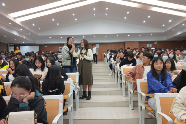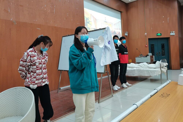 话剧表演——防疫那些事儿。话剧以普通护士袁莉一家的视角展开,演绎出了普通百姓对于抗疫的支持以及医务工作者在抗击新冠病毒疫情中的奉献精神。之后进行的是疫情防控知识有奖问答环节。台下同学积极踊跃参加知识问答活动,同学们情绪高涨,积极回答问题,极尽视听之余,同学们心潮澎湃,气氛高涨。